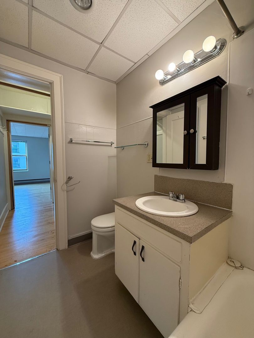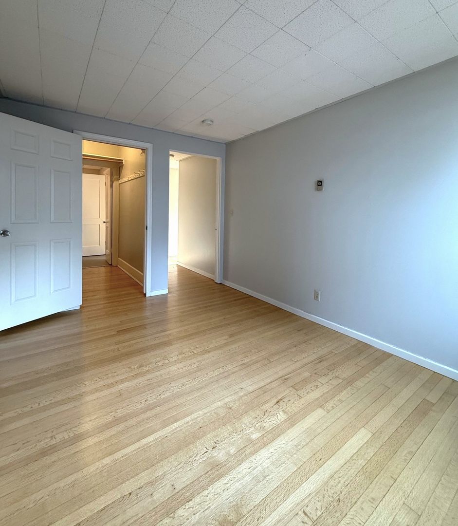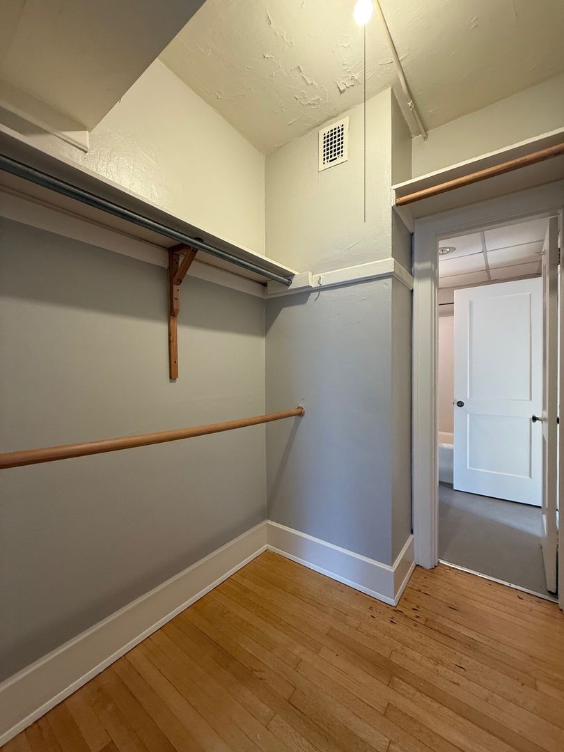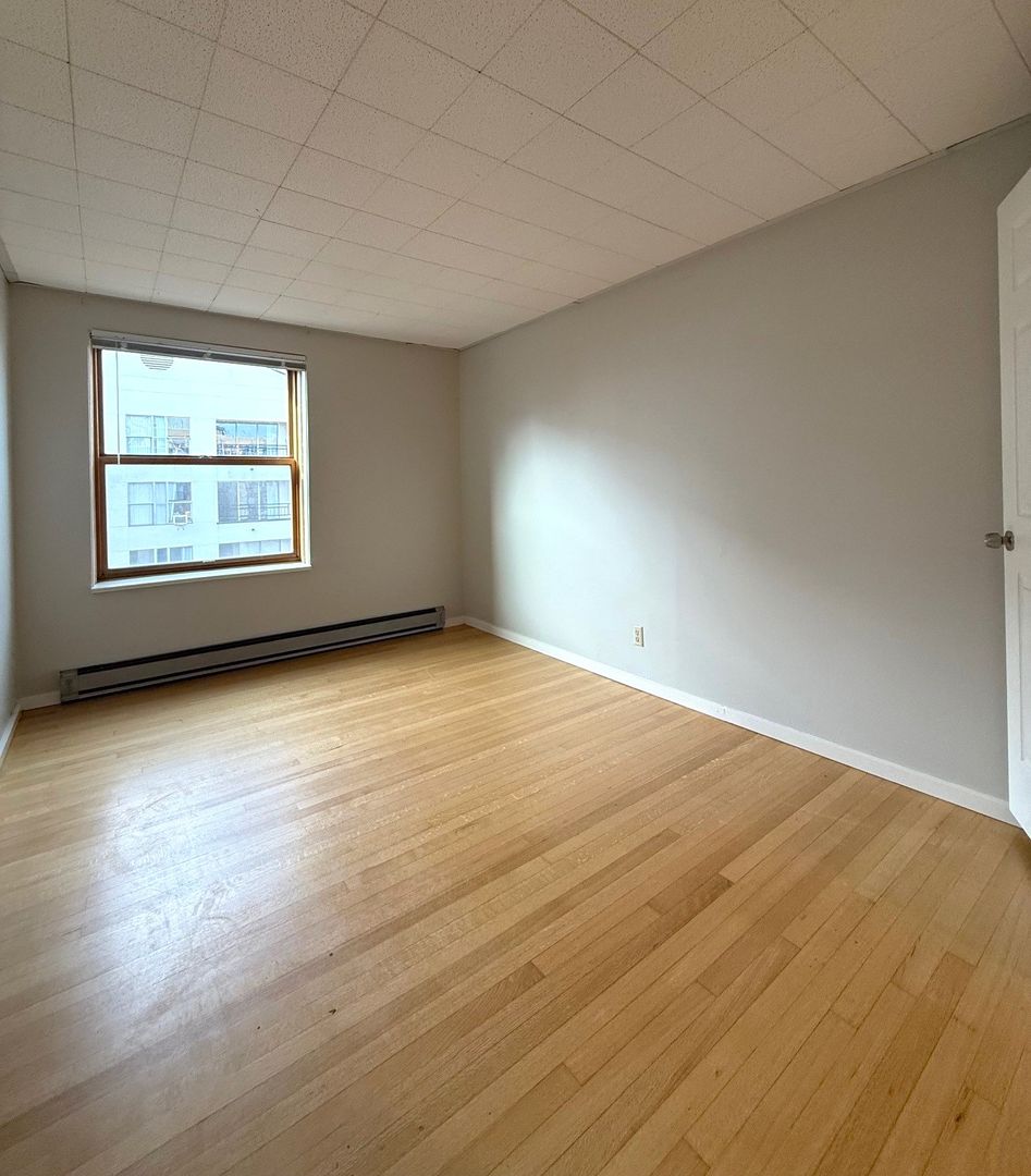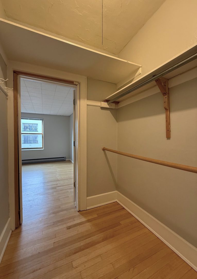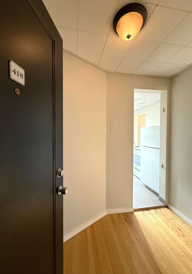 Unit 418 is a top floor corner 1 bedroom that faces the interior courtyard and receives great natural light. There are hardwood floors throughout, new vinyl in the kitchen and bathroom, a walk-in closet off the bedroom and a cozy L-shaped kitchen.